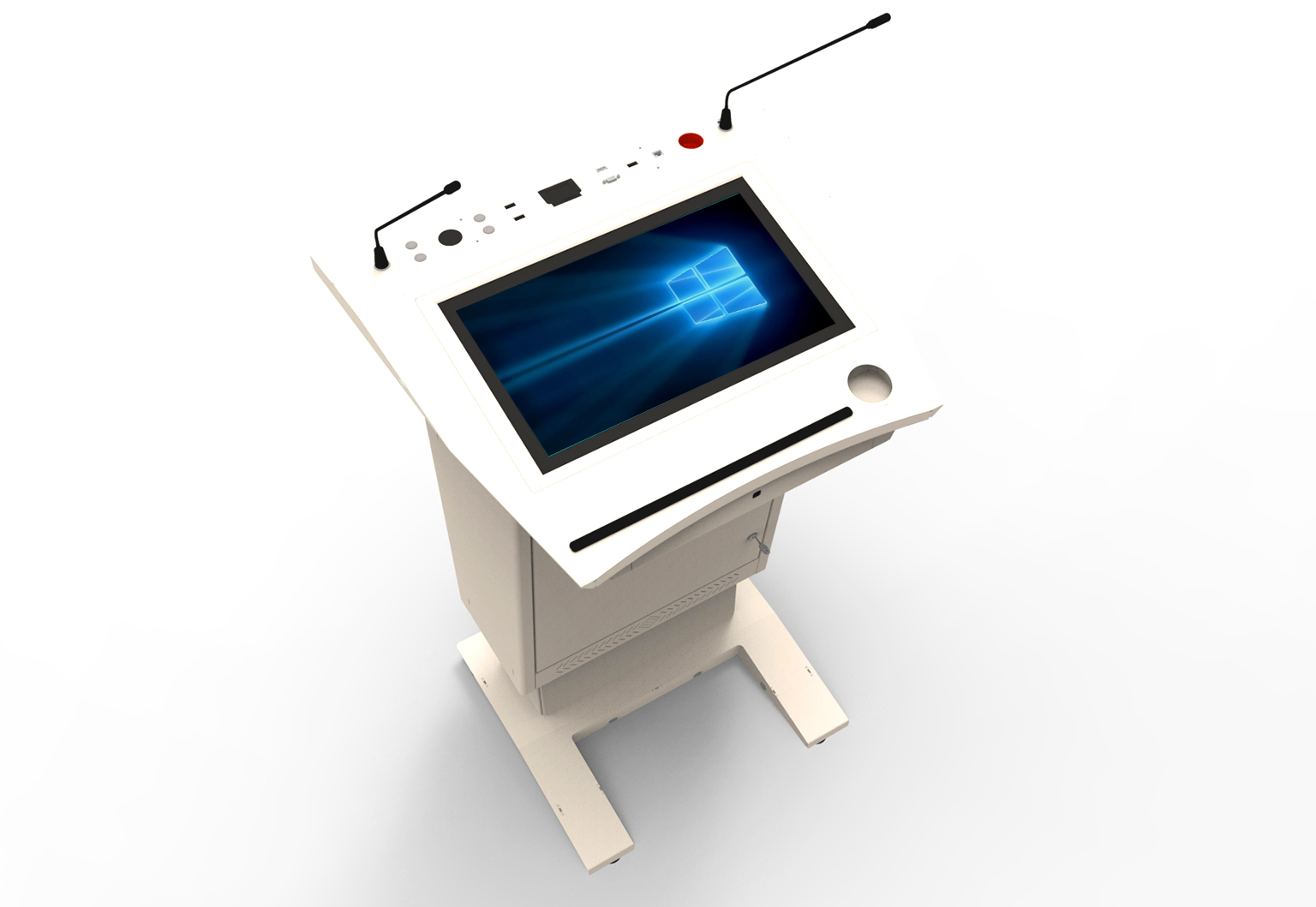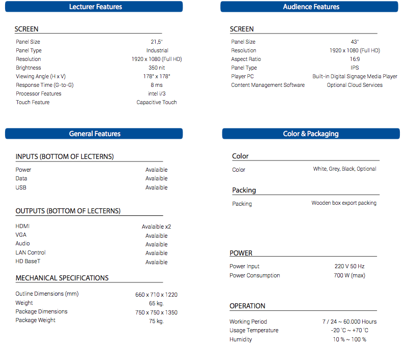 Sunum ortamında konfor ve hakimiyetini arttırmak için özel olarak tasarlanan asansörlü gövde sistemi ile kürsü yüksekliğini dilediğiniz şekilde ayarlayabilirsiniz.
