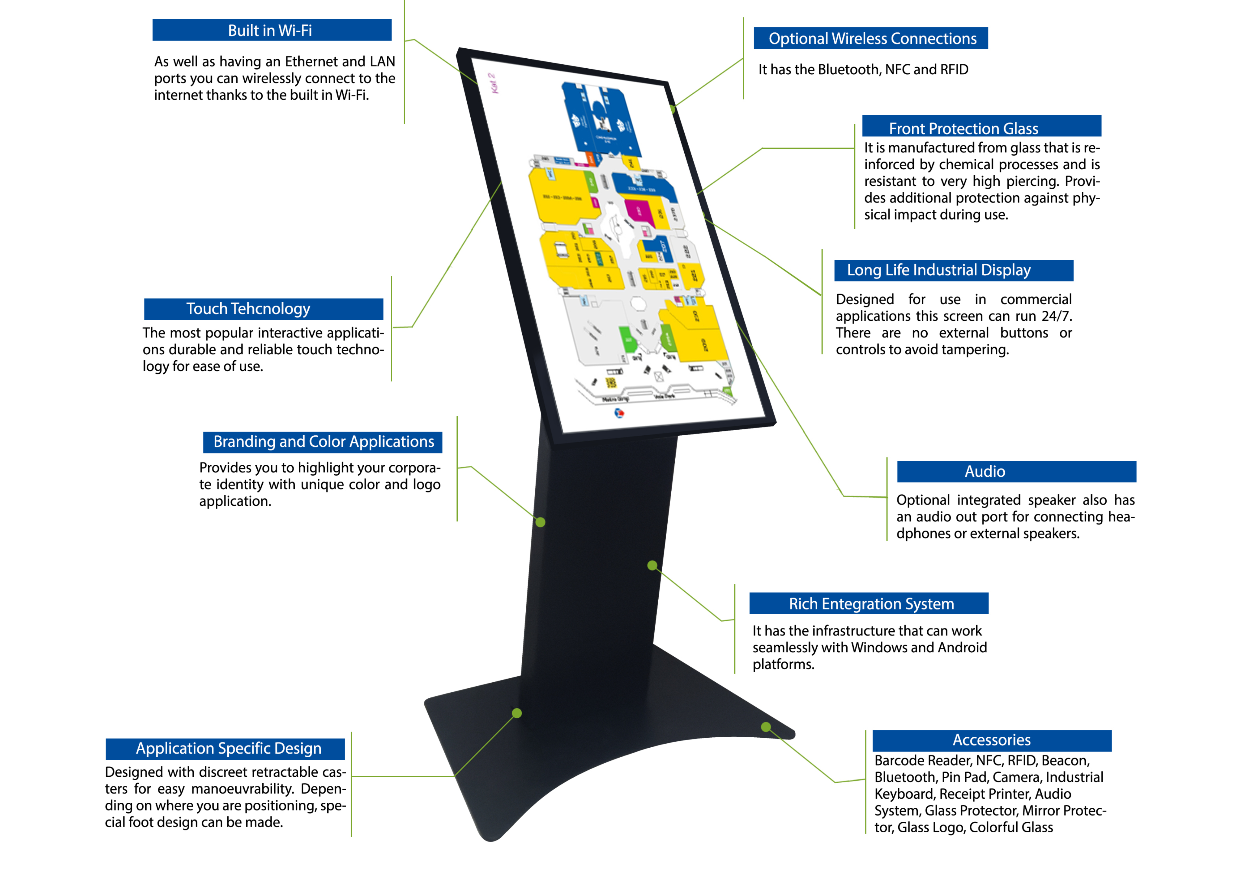 Unisign Kiosk, marka ya da organizasyonların hedef kitle ile etkileşimini sağlayan ,düşük maliyetli,sınırsız kullanım alanına sahip , 7/24 çalışabilen,endüstriyel tasarımlı,taşınabilir ürünlerdir.Öne Çıkan Özellikler