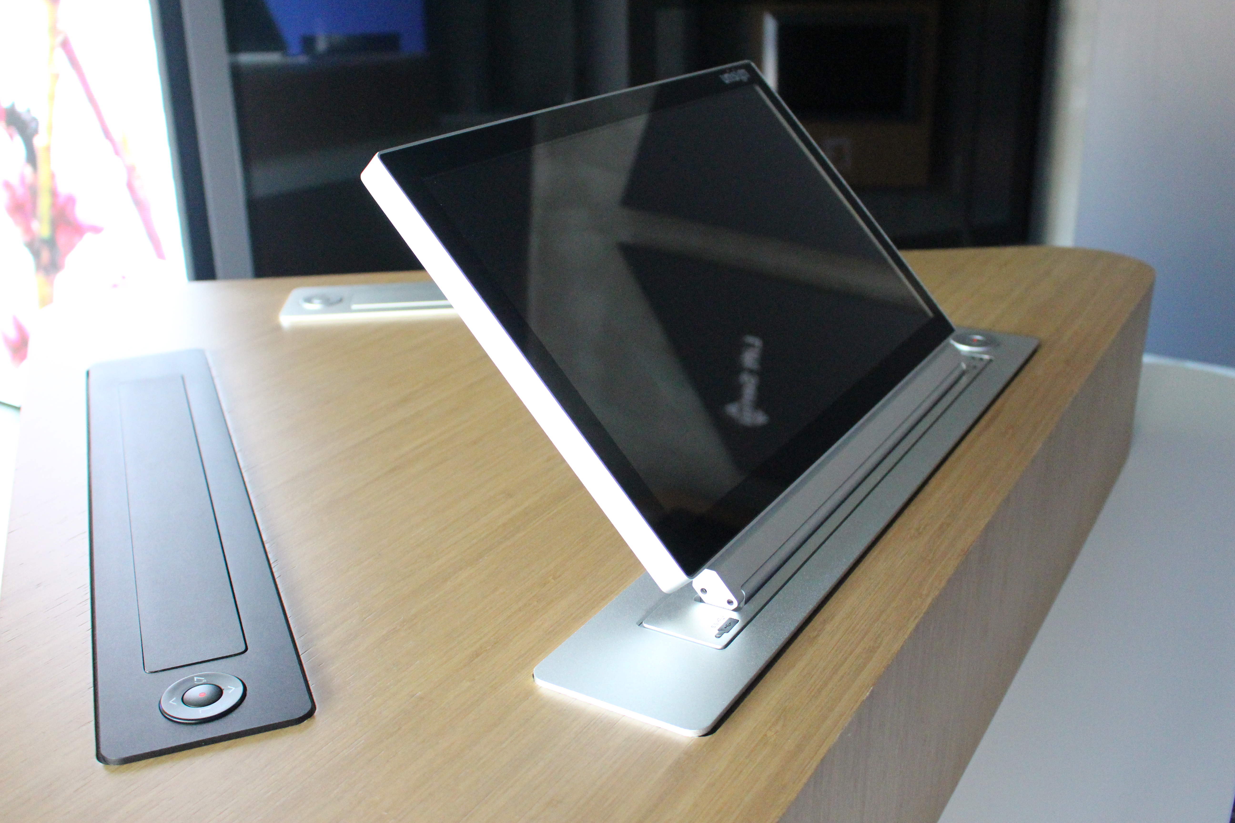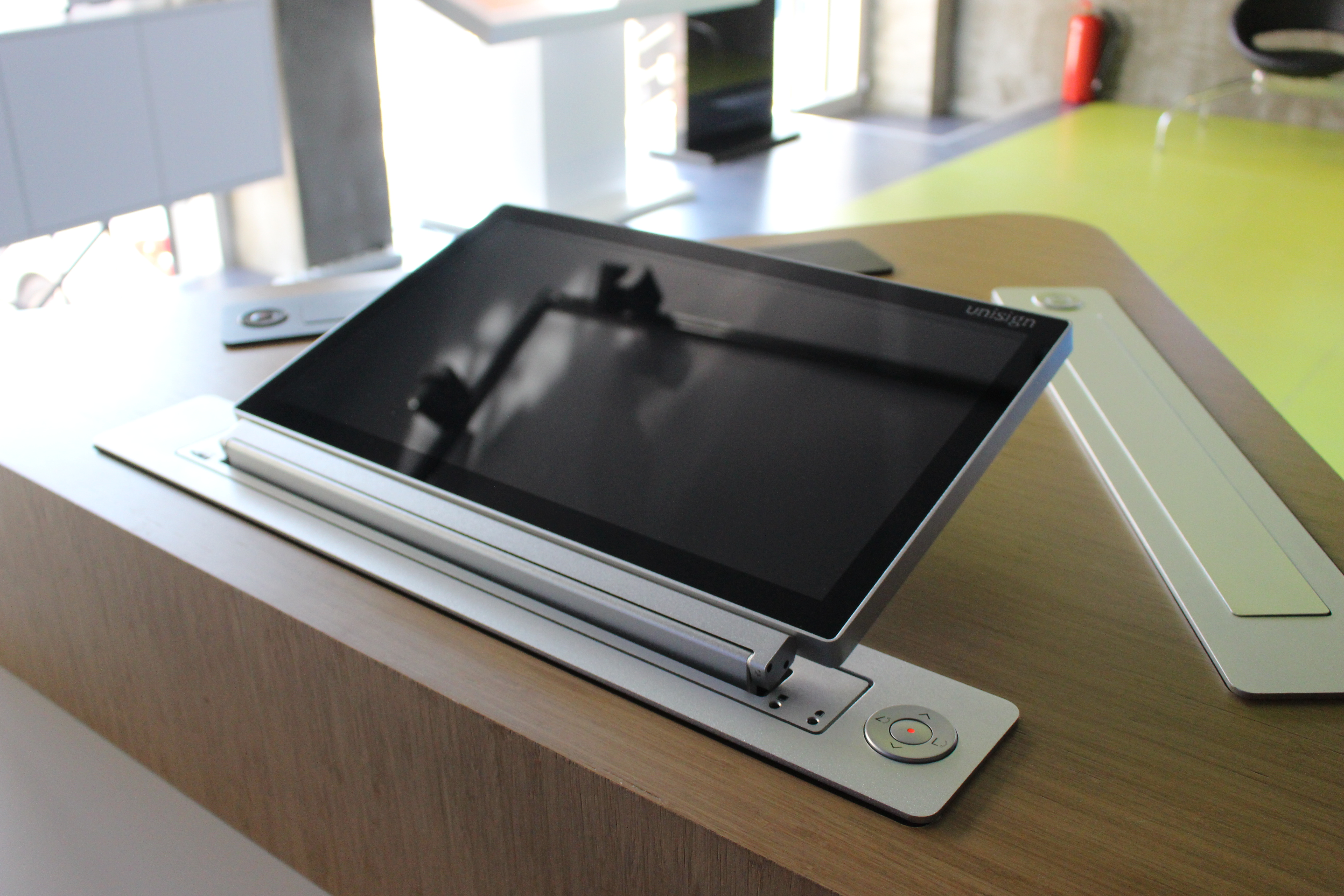 Asansörlü dijital bilgilendirme ekranları şık alüminyum gövdesi, dekoratif görünümü ve isteğe bağlı çoklu dokunmatik özelliğiyle prestijli ortamlarda kullanılmak üzere tasarlanmıştır. Gizlenebilir mekanizması sayesinde ihtiyaç esnasında masa üstüne çıkar, kullanımı bittikten sonra kolayca kapanır.Öne Çıkan Özellikler