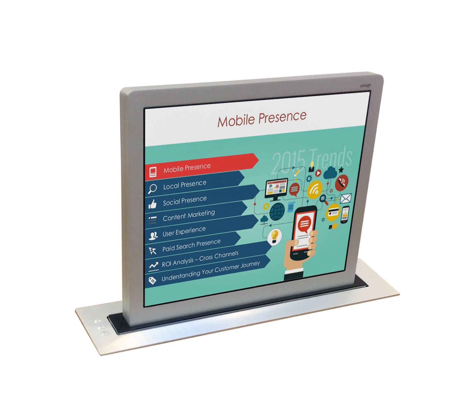 Asansörlü dijital bilgilendirme ekranları şık alüminyum gövdesi, dekoratif görünümü ve isteğe bağlı çoklu dokunmatik özelliğiyle prestijli ortamlarda kullanılmak üzere tasarlanmıştır. Gizlenebilir mekanizması sayesinde ihtiyaç esnasında masa üstüne çıkar, kullanımı bittikten sonra kolayca kapanır.Öne Çıkan Özellikler