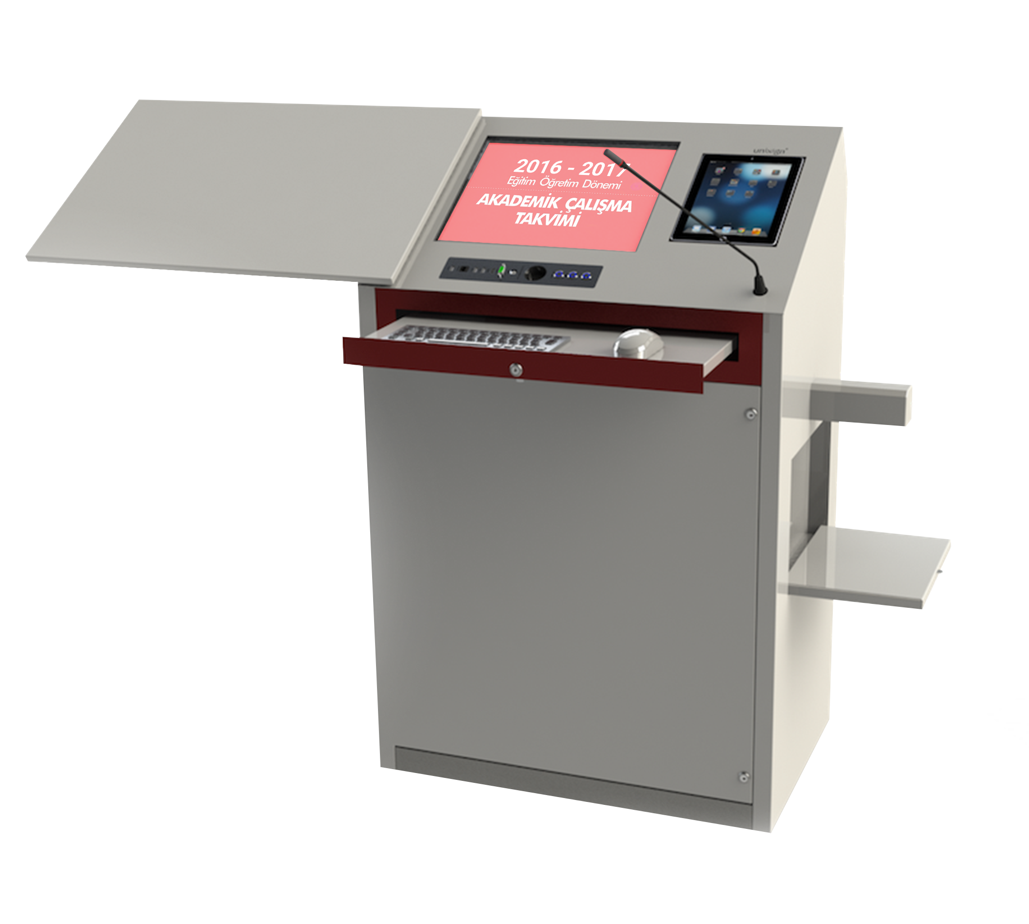 Sınıf ortamında, sunumlarınızda size en rahat ve güvenli kullanımı sağlayabilmek için tasarlanmış dijital kürsüler; kilitli kamara bölmesi, kızaklı üst koruma kapağı, çekmece, laptop koyma alanı, hakimiyetinizi kolaylaştıracak gövde yapısı, bağlantı ekipmanları vb. özelliklere sahiptir.