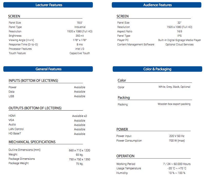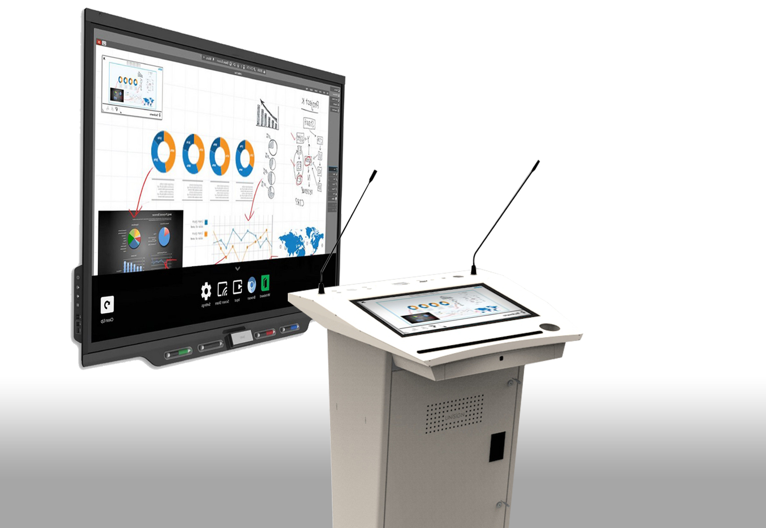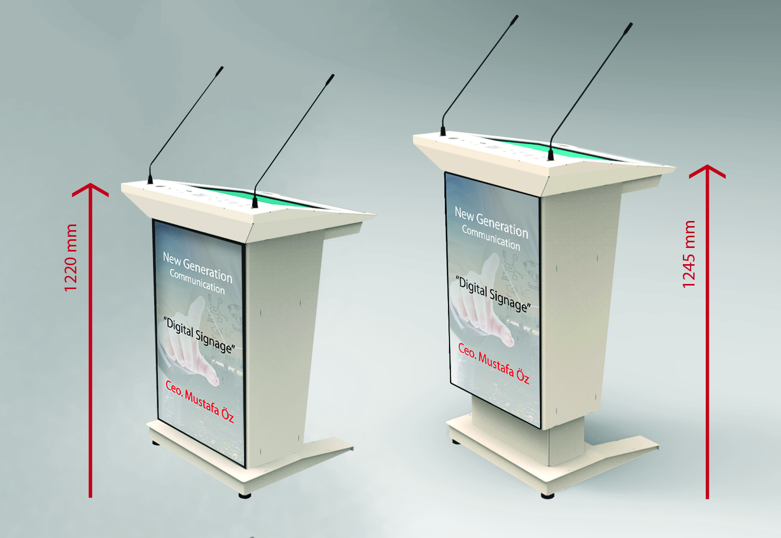 Sunum ortamında konfor ve hakimiyetini arttırmak için özel olarak tasarlanan asansörlü gövde sistemi ile kürsü yüksekliğini dilediğiniz şekilde ayarlayabilirsiniz.