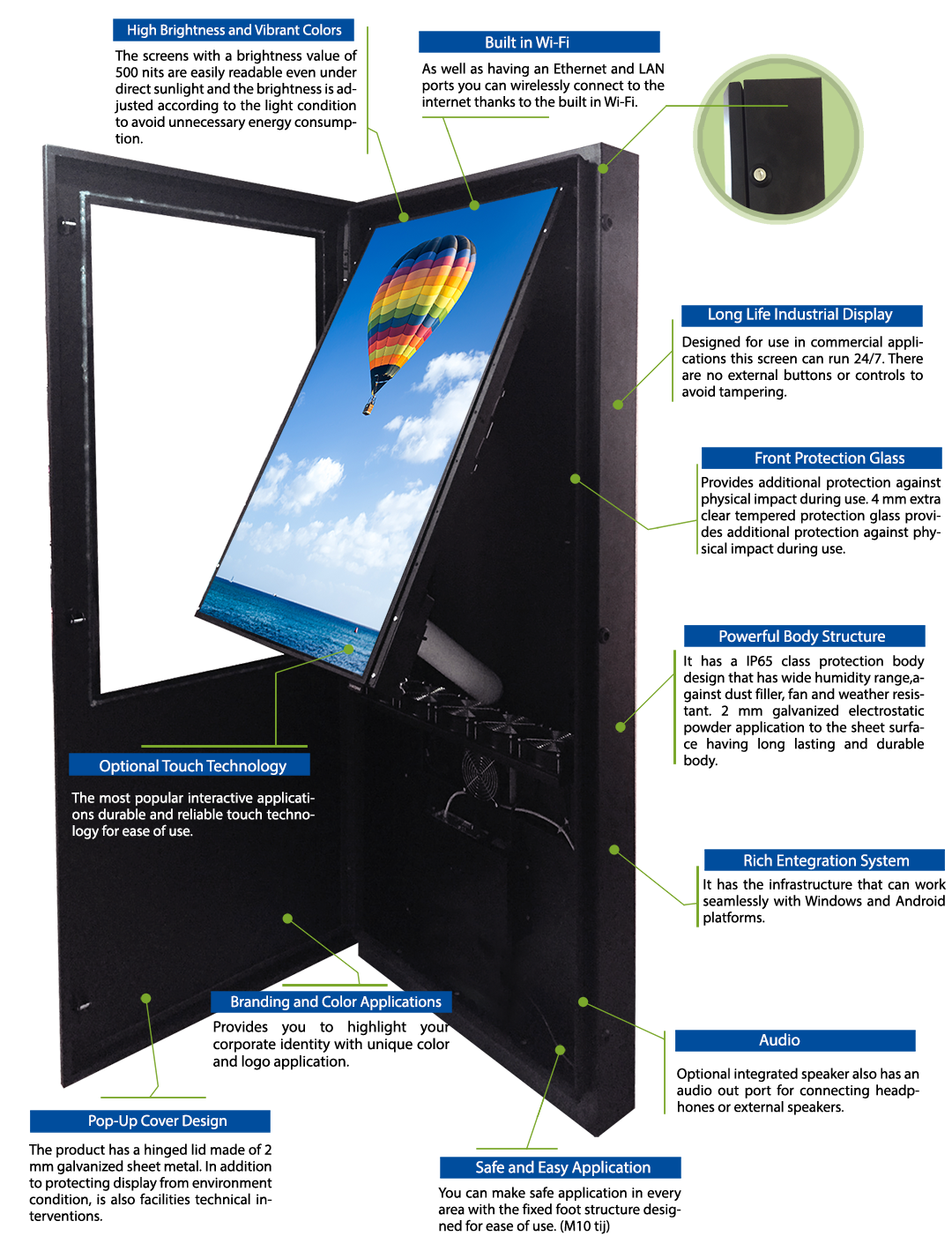 Unisign Totemler iç ve dış kullanıma uygun tasarlanmış, sessiz ve tamamen fansız yapısıyla 7/24 çalışabilen ürünlerdir.
