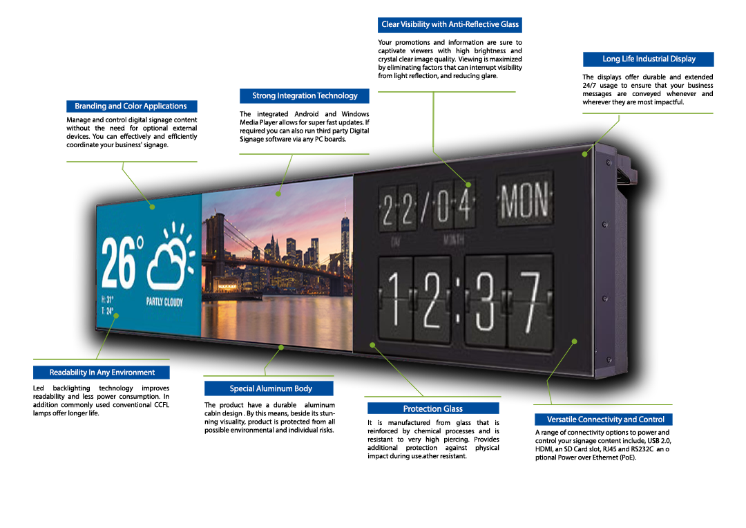 Alanlarınızı en iyi şekilde değerlendirmenizi hedefleyen ve dikey/yatay modda uygulanabilen Bar Ekranlar kısıtlı alanlarda dahi hedef kitlenizi etkilemek için en doğru uygulamalardır.Öne Çıkan Özellikler