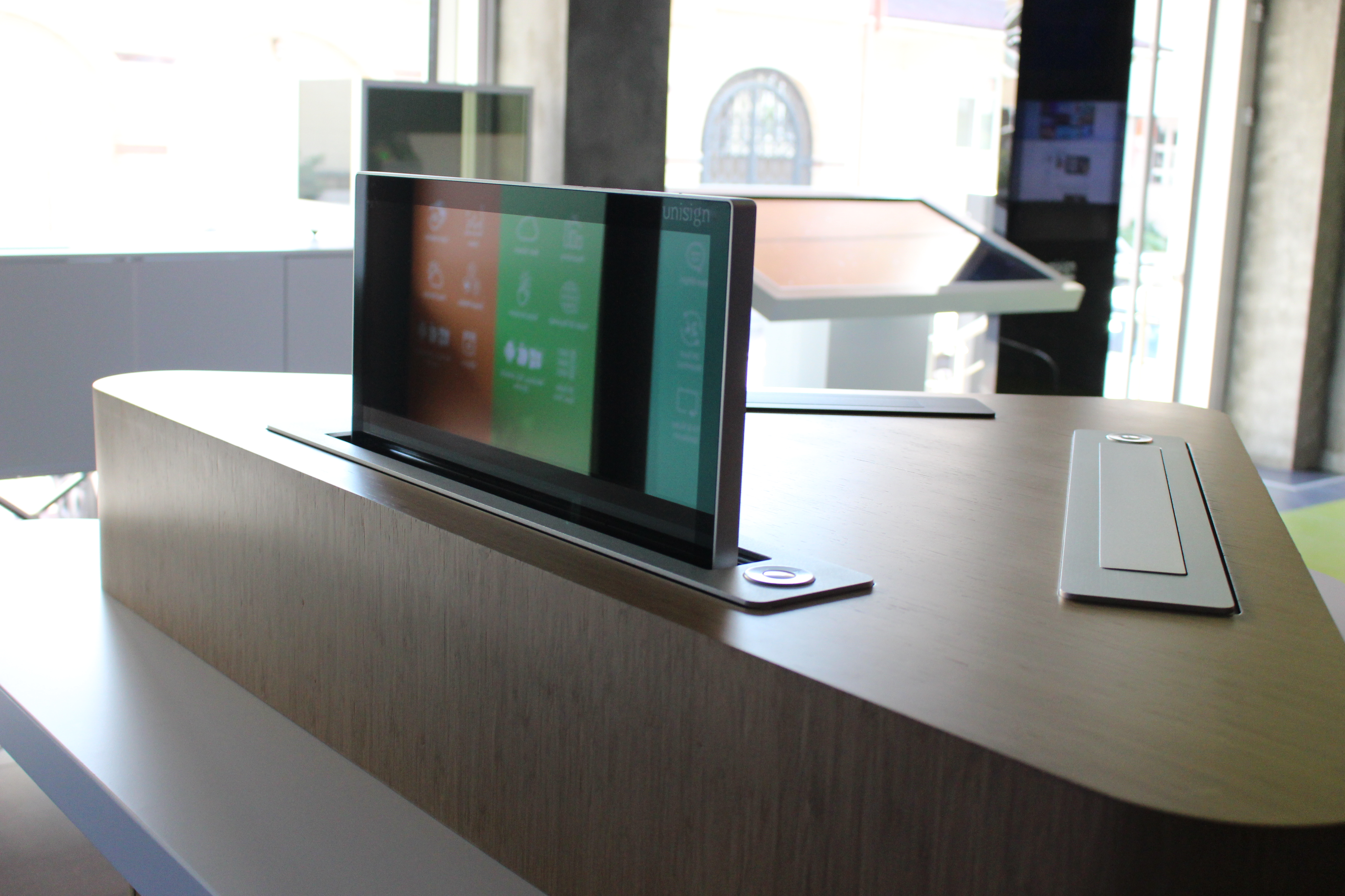 Asansörlü dijital bilgilendirme ekranları şık alüminyum gövdesi, dekoratif görünümü ve isteğe bağlı çoklu dokunmatik özelliğiyle prestijli ortamlarda kullanılmak üzere tasarlanmıştır. Gizlenebilir mekanizması sayesinde ihtiyaç esnasında masa üstüne çıkar, kullanımı bittikten sonra kolayca kapanır.Öne Çıkan Özellikler