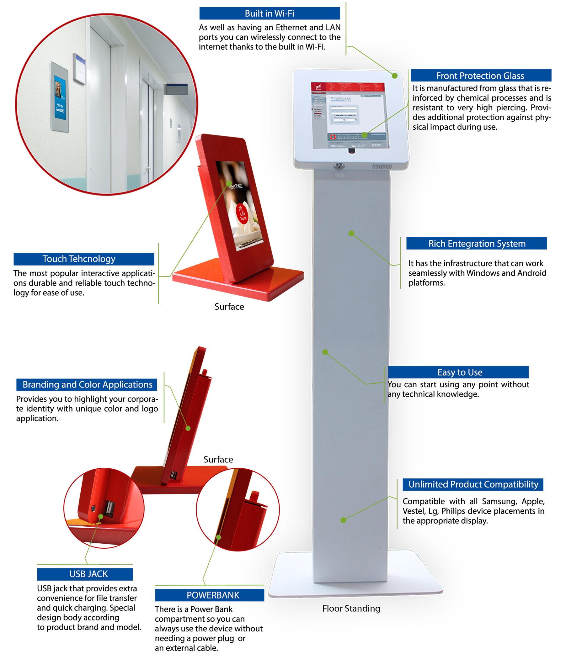 Unisign Kiosk, marka ya da organizasyonların hedef kitle ile etkileşimini sağlayan ,düşük maliyetli,sınırsız kullanım alanına sahip , 7/24 çalışabilen,endüstriyel tasarımlı,taşınabilir ürünlerdir.Öne Çıkan Özellikler