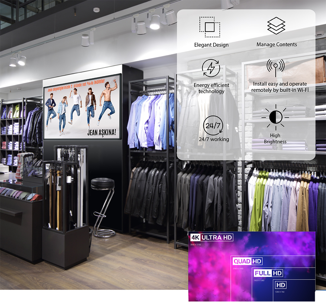 Ziyaretçilerin ilgisini çekin ve çarpıcı görünürlük ile mesajları daha etkili bir şekilde iletin. Unisign Signage, kusursuz görünürlük için 2.500 nit parlaklık ve 5000: 1 kontrast oranına sahiptir. Direkt güneş ışığında karartma kusuru yoktur.Öne Çıkan Özellikler