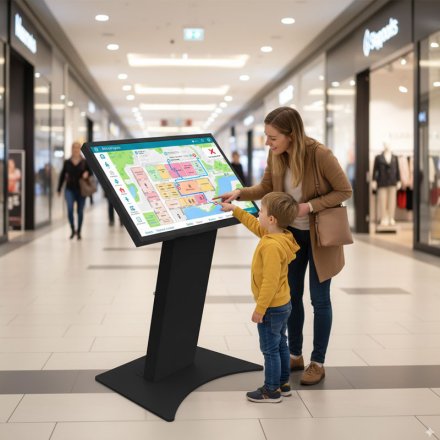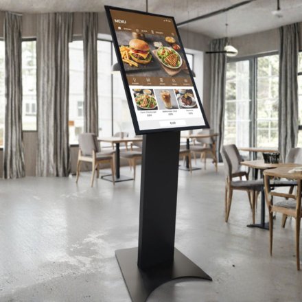 The angled stand design provides ergonomic benefits while creating a professional appearance that works effectively in both landscape and portrait orientations. This flexibility allows customization of the user experience based on application requirements, whether displaying wayfinding information, product catalogs, or interactive services that benefit from specific screen orientations.