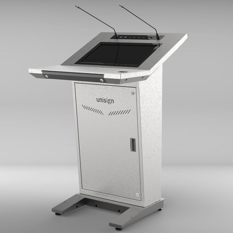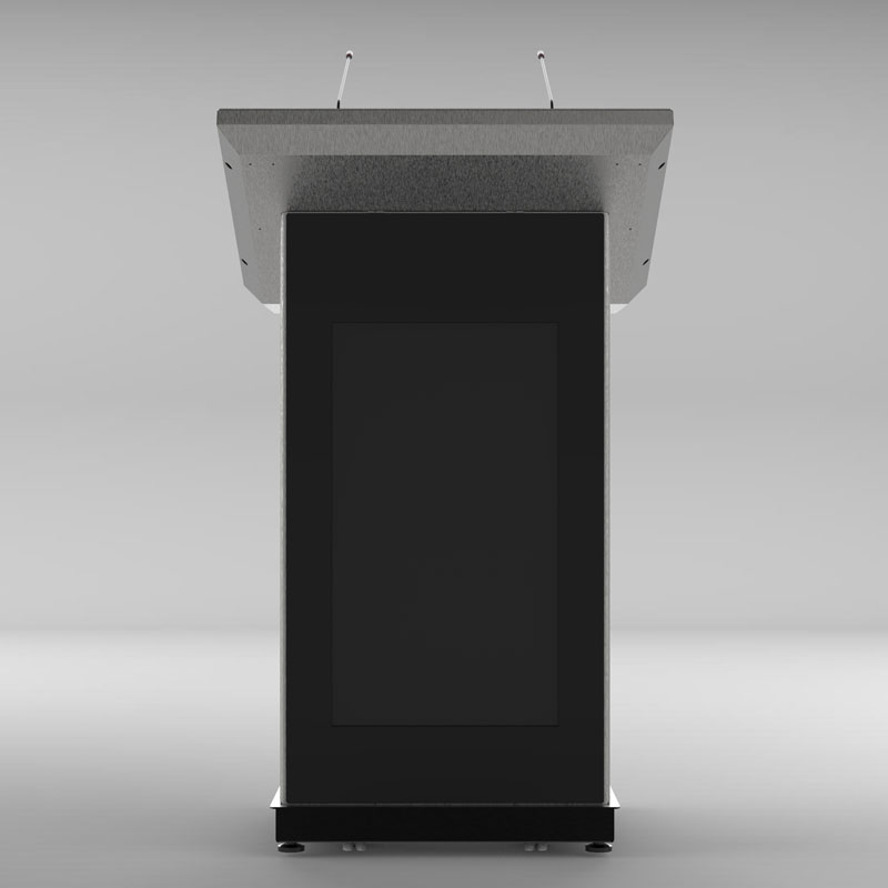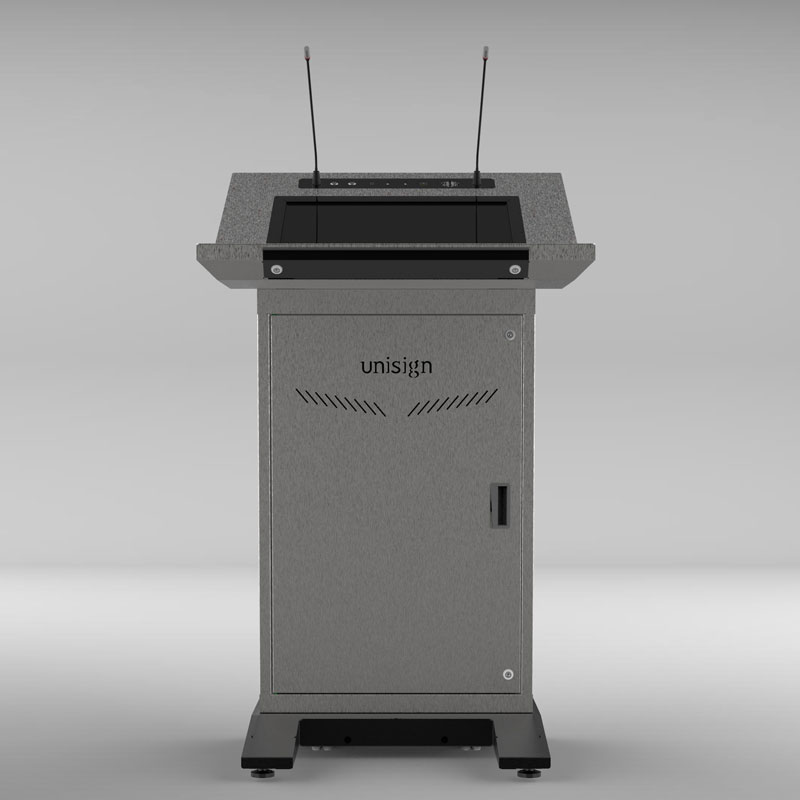 PM201, sağlam metal şasiyi zarif cam kaplamalı ön panelle birleştirerek istikrar ve prestij hissi uyandırır. Bu tasarım yalnızca teknolojiyi barındırmakla kalmaz, aynı zamanda onu vurgular. Ön ekran, metal yüzeye kusursuz bir şekilde entegre edilmiştir ve temiz, üst düzey bir görünüm sunar. Bu kürsü sadece bilgi aktarmakla kalmaz; kuruluşunuzun kaliteye ve teknolojiye olan bağlılığını güçlü bir biçimde ifade eder.