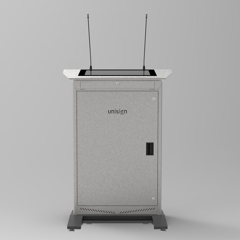 PM501 deneyimi, etkileyici görsel alanı ile tanımlanır. Sunucu için geniş 21.5”/18.5” dokunmatik ekran, kolay kontrol için akıcı ve konforlu bir çalışma alanı sunar. Ancak asıl etki izleyici tarafında ortaya çıkar. 43” veya 32” boyutlarında devasa ön ekran, yüksek çözünürlüklü dijital bir tuval görevi görür. Bu yalnızca bir logo ekranı değildir; ek verilerin, canlı video akışlarının, detaylı infografiklerin veya güçlü marka unsurlarının yayınlanması için birincil iletişim kanalını oluşturur ve mesajınızın görsel alanda hâkimiyet kurmasını sağlar.