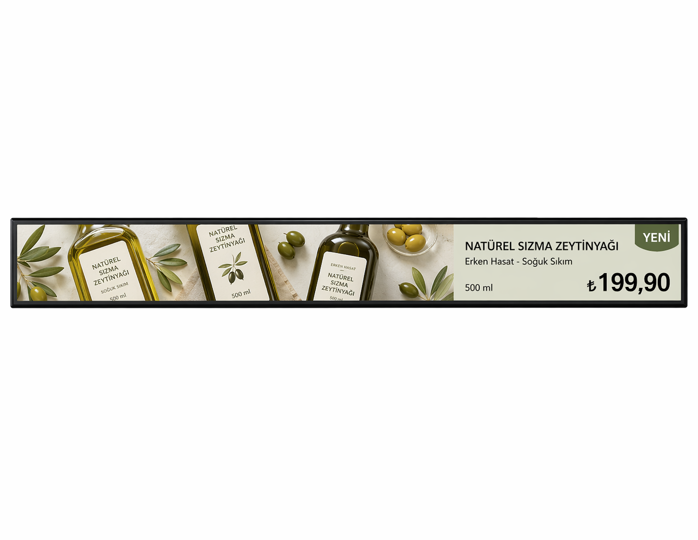 Uzun ve kesintisiz ekran yapısı sayesinde birden fazla ürün bilgisi tek etiket üzerinde gösterilir. Ultra ince ve çerçevesiz tasarımı raflara kusursuz şekilde entegre olur ve mağazaya modern bir görünüm kazandırır.