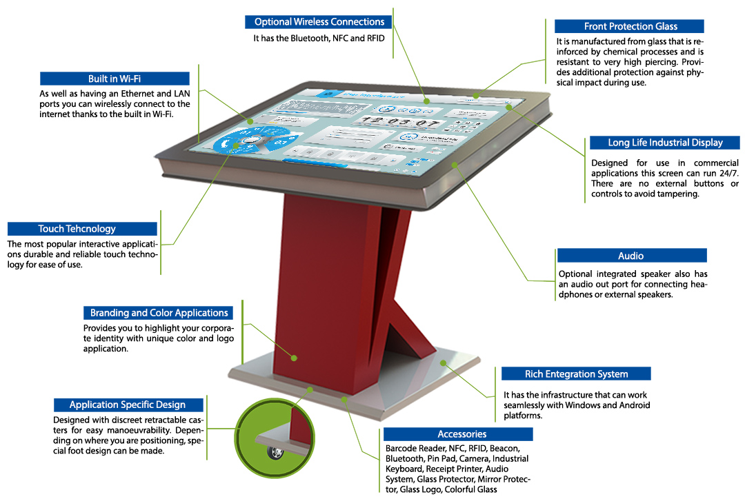 Unisign Kiosk, marka ya da organizasyonların hedef kitle ile etkileşimini sağlayan ,düşük maliyetli,sınırsız kullanım alanına sahip , 7/24 çalışabilen,endüstriyel tasarımlı,taşınabilir ürünlerdir.Öne Çıkan Özellikler
